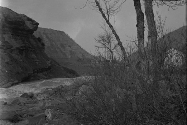 Lungo la mulattiera di fondovalle del Bidente di Ridracoli, presso Ridracoli. Stratificazione marnoso arenacea del Langhiano.